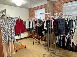Currently, the Clothesline Ministry occupies the upstairs rooms at St. John’s. The rooms and clothes are sorted for children, women, women dressy, men’s pants, men’s shirts, a shoe room/socks/blankets room.